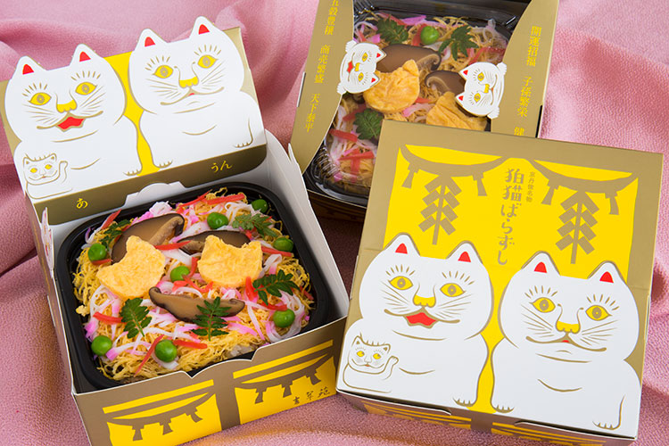お祭りや祝い事などハレの日に欠かせないおもてなしの郷土料理。自家製の鯖のおぼろ、紅生姜、錦糸卵で覆い、旬の食材を使用した彩り鮮やかなお寿司です。折って飾れる仕掛け付き狛猫パッケージ入り。